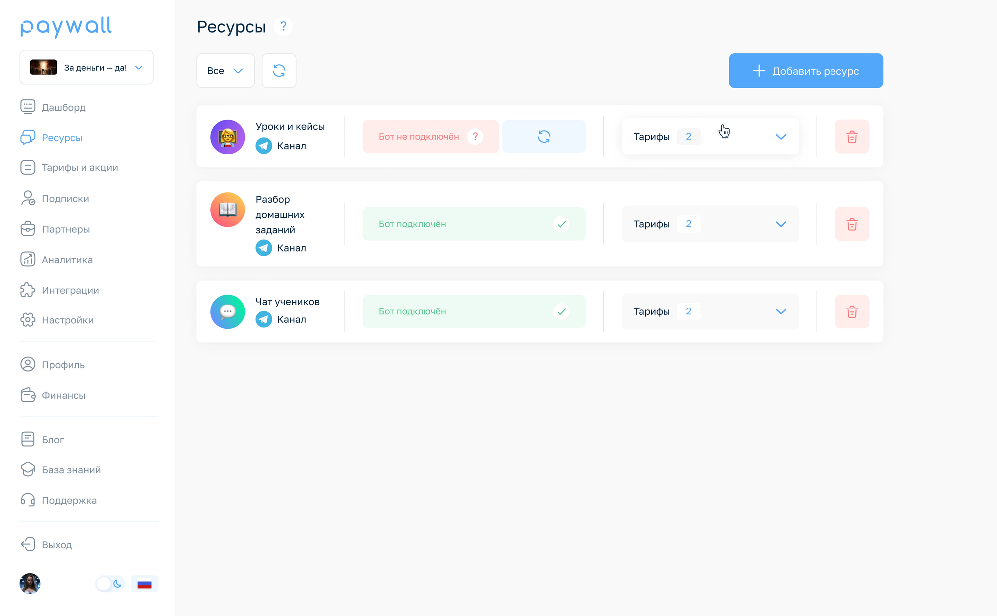 - Paywall — подключает несколько каналов и чатов сразу, а доступом к ним управляет автоматически.