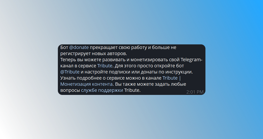 Раньше авторы могли подключить donate bot и получать переводы от аудитории прямо в канале. Это был простой способ собрать донаты через тг: читатель нажимал кнопку, отправлял деньги, а автор получал поддержку. Но сейчас сервис Donate больше не работает — проект закрыли и перенесли на новую платформу Tribute.