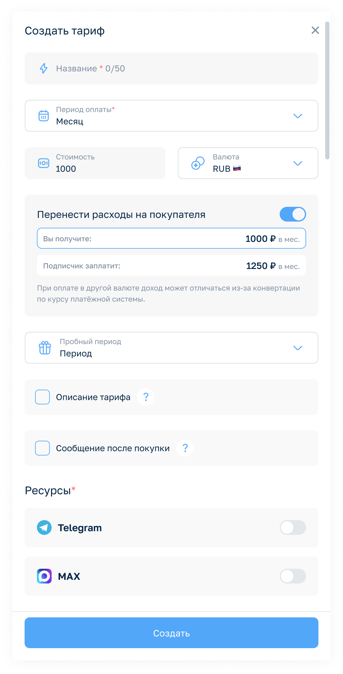 Нужно указать название тарифа, выбрать период оплаты, задать стоимость и отметить, к какому ресурсу он будет привязан — каналу в MAX, группе или сразу к обоим. Здесь же можно перенести комиссию сервиса на подписчика, добавить пробный период, короткое описание тарифа и сообщение, которое пользователь увидит после покупки.
