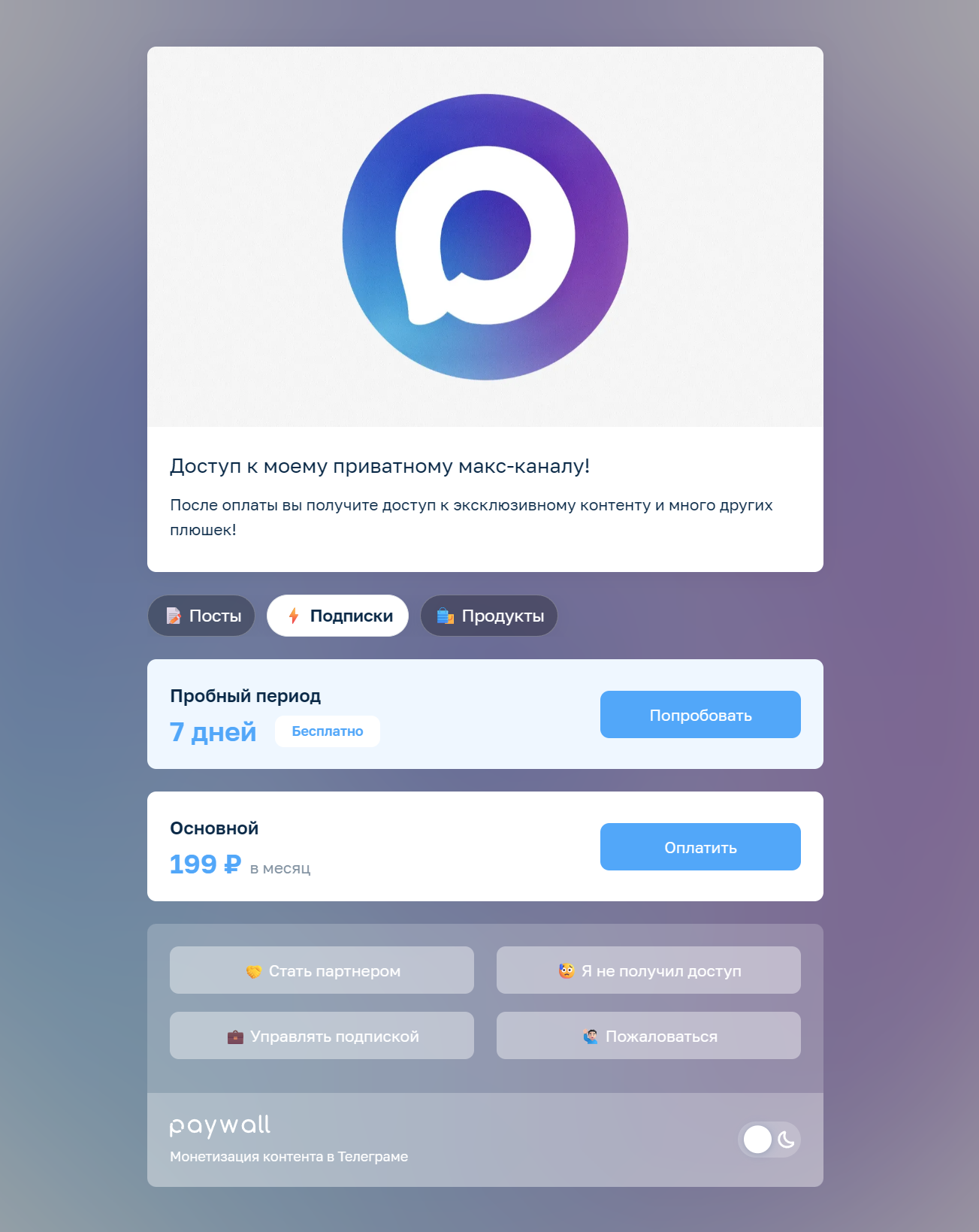 Именно здесь связка MAX и Paywall выглядит самой практичной. MAX остаётся площадкой для контента и аудитории, а Paywall помогает оформить платный доступ, настроить подписку и сделать канал не просто закрытым, а монетизируемым продуктом.