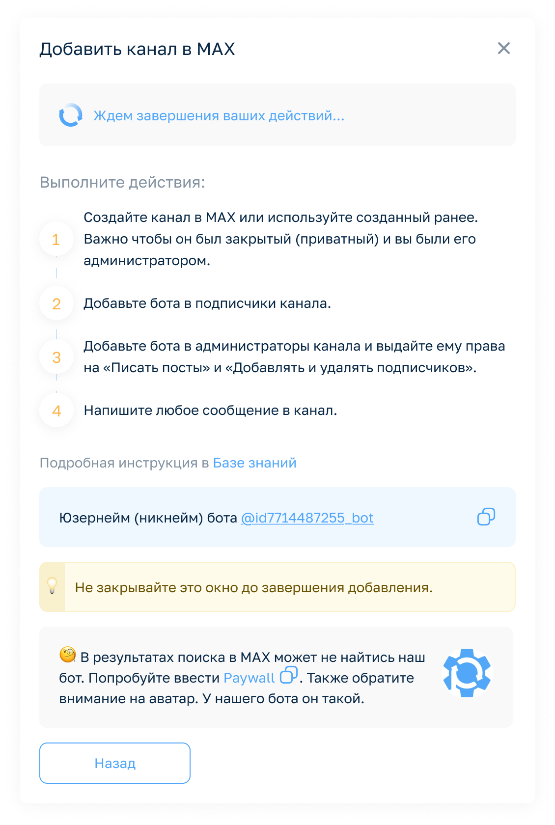После этого вы можете подключить к проекту закрытый канал или закрытую группу в MAX. Для этого нужно выполнить несколько шагов — сервис показывает их прямо в окне добавления, поэтому ориентироваться на этом этапе обычно несложно.