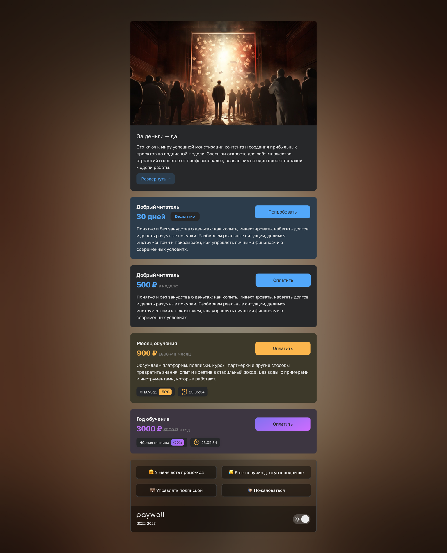 В Paywall всё иначе: автор может создавать подписочные и разовые тарифы, включать скидки, проводить акции. Есть даже партнёрская программа и аналитика, которая показывает, какие тарифы работают лучше.