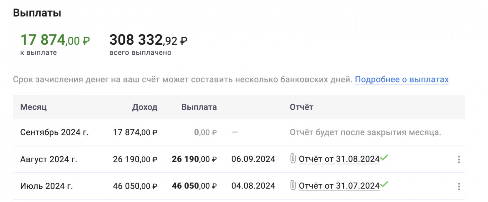 - ИП и юридические лица получают выплаты автоматически ежедневно.