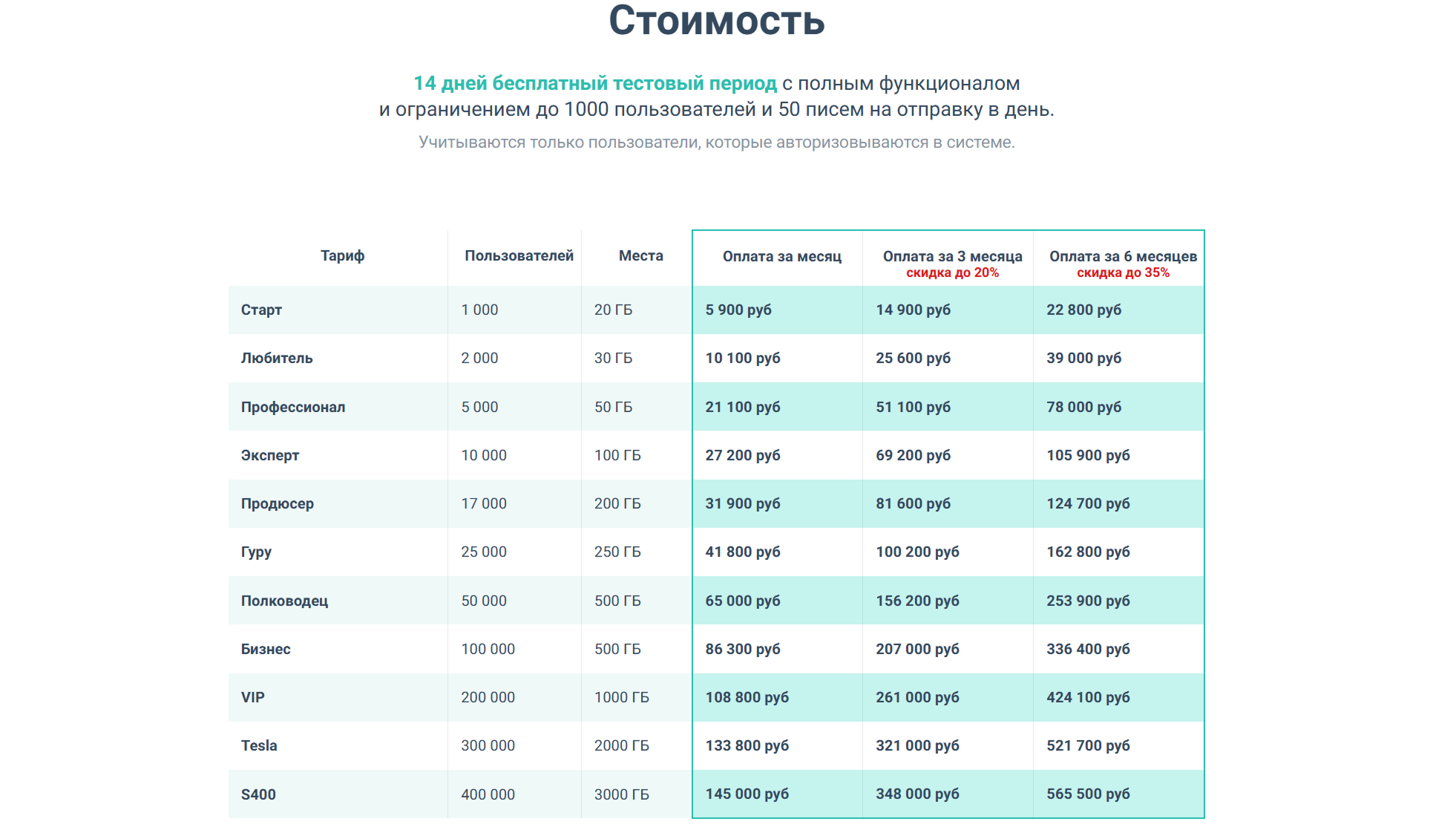 - Есть тестовый период 14 дней с полным функционалом (с ограничениями по числу пользователей/рассылок).