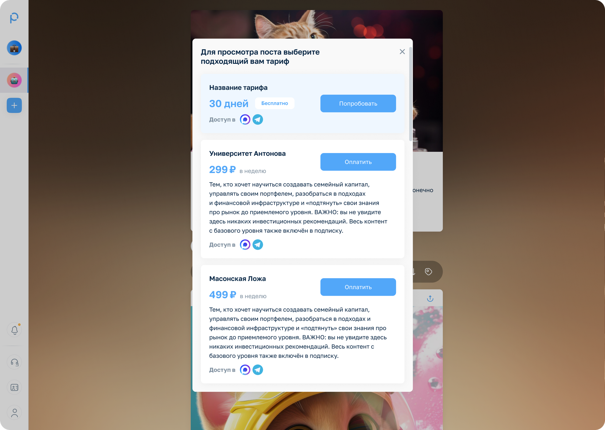 Если ваш проект живет в разных социальных сетях или мессенджерах, то сливать лояльную аудиторию на платный проект по подписке лучше всего в Paywall. Здесь вы сможете общаться с аудиторией и на своей странице и через мессенджеры. Широкий функционал платформы позволит эффективно развивать проект.