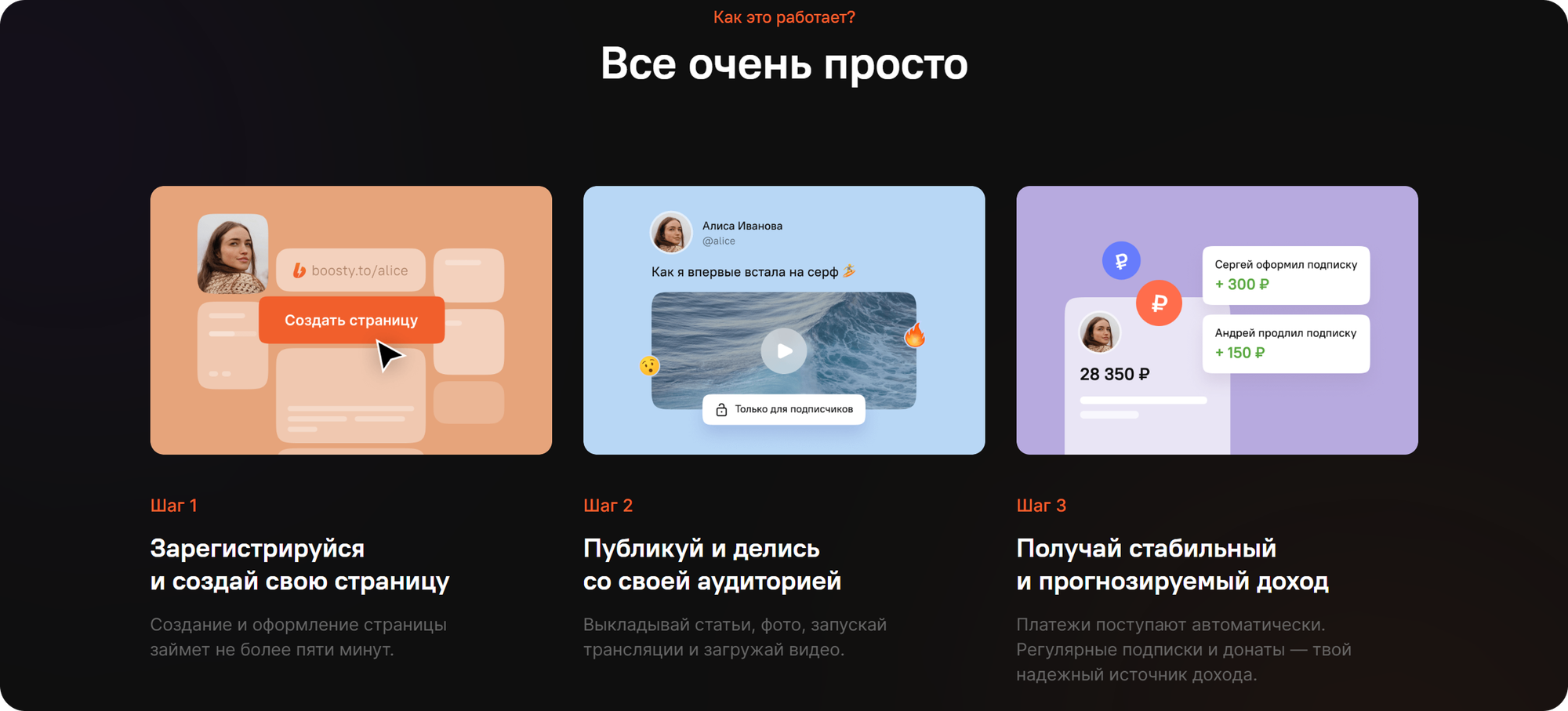 Boosty — классическая “лента + уровни подписки”: страница автора, посты, разные уровни доступа, плюс возможность продавать контент точечно (не только по подписке). Формат знаком аудитории: подписался — читаешь ленту.