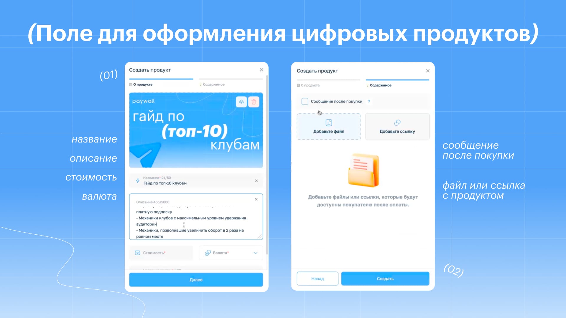 - Прикрепите файлы. В один продукт можно упаковать до 10 вложений (видео, PDF, таблицы) весом до 1 Гб. Если видео тяжелее — просто вставьте ссылку на облачное хранилище или любой другой ресурс, где оно размещено в закрытом доступе.